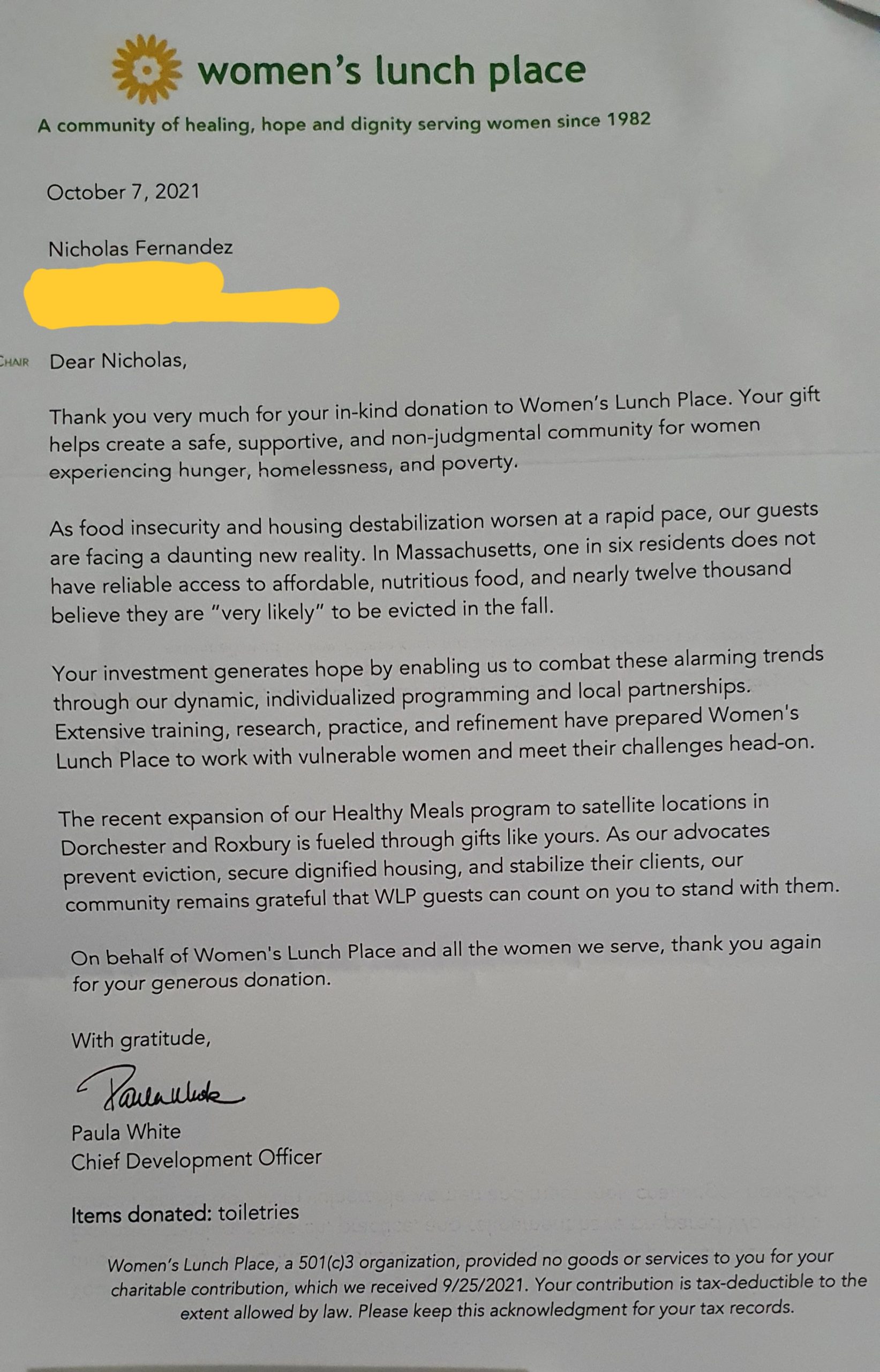 Thank you to the Women’s lunch place for distributing the products and we are looking forward to donating and volunteering more.